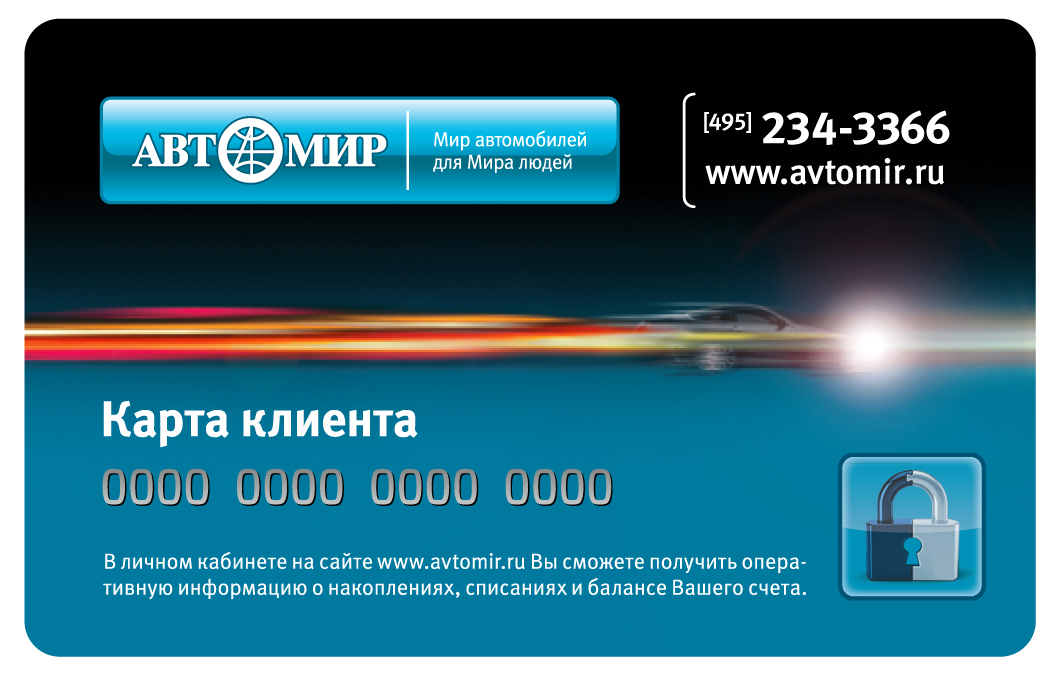 Карта Клиента является собственностью Компании Автомир и должна быть безвозмездно возвращена собственнику по первому его требованию.